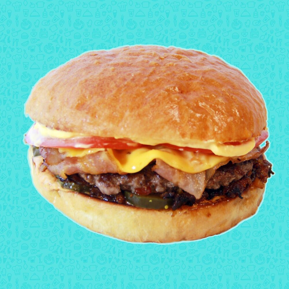 Фирменный соус, сырный соус, сол. огурец, мраморная говядина, джем из бекона, бекон с/к, сыр "Чеддер" помидор.