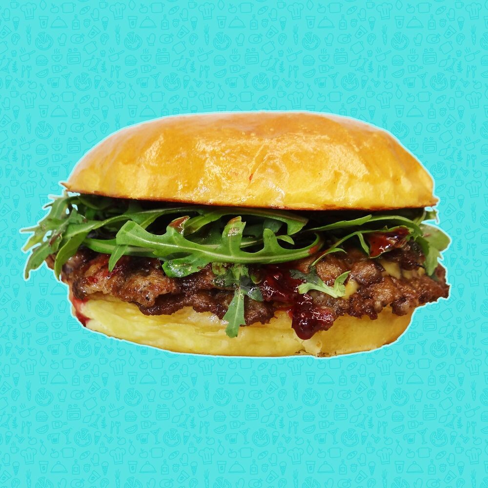 Соус фирменный, сол. огурец, 2 котлеты из мраморной говядины, сыр «Чеддер», соус «Брусничный», руккола