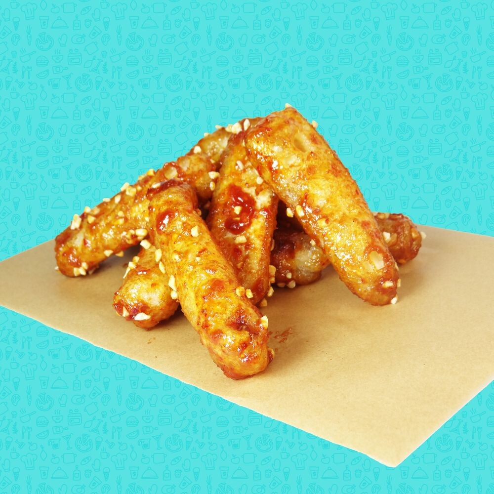 Баклажаны жареные в хрустящем кляре, соус остро-сладкий, арахис.