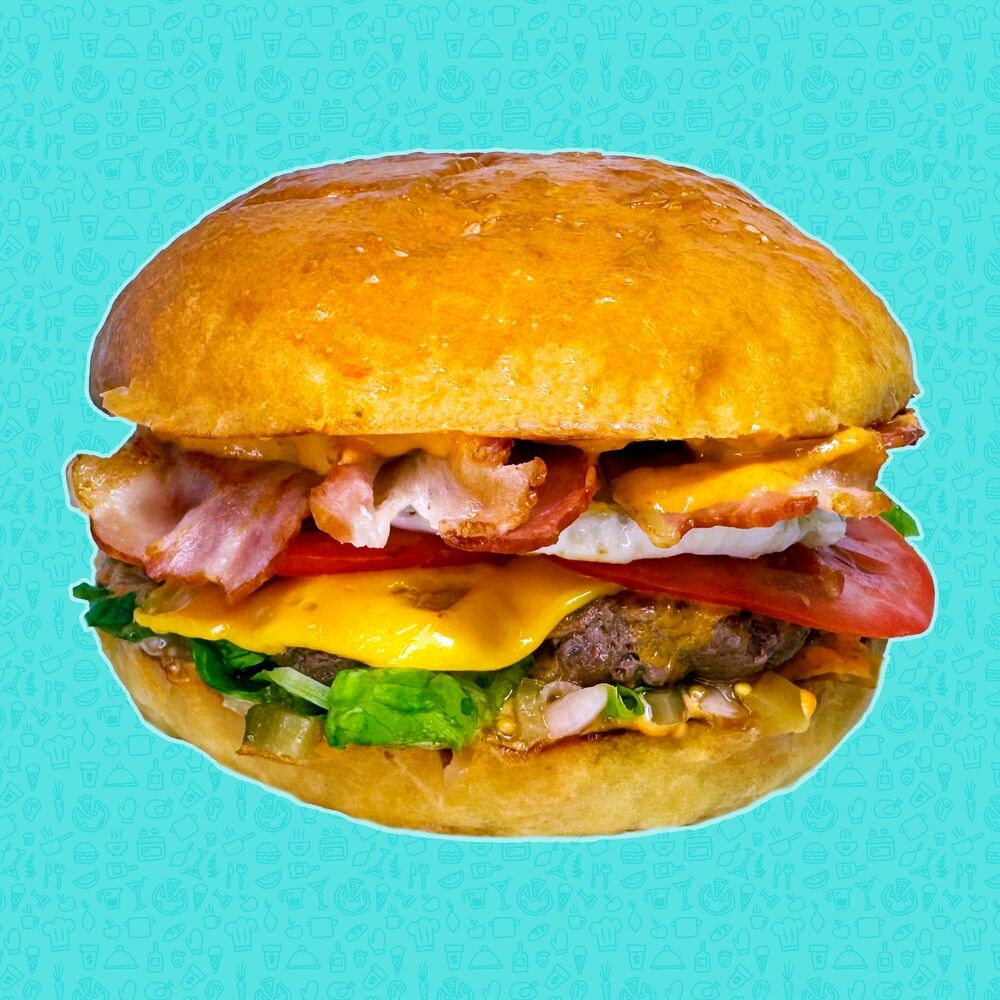 Фирменный соус, лук, сол. огурец, салат, мраморная говядина, яйцо, бекон с/к, сыр "Чеддер", помидор