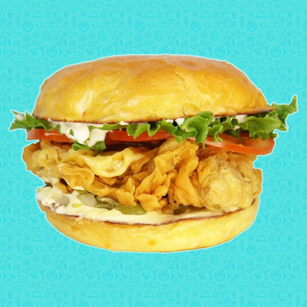 Соус фирменный, лук, сол. огурец, куриное бедро в кляре, сыр "Чеддер", помидор, салат, соус "Чесночный"