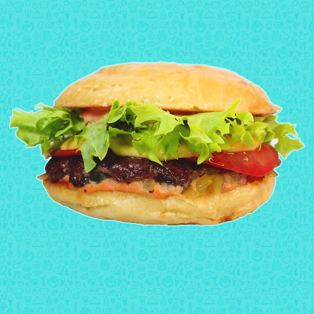 Фирменный соус, лук, соленый огурец, сыр "Чеддер", мраморная говядина, помидор, салат.